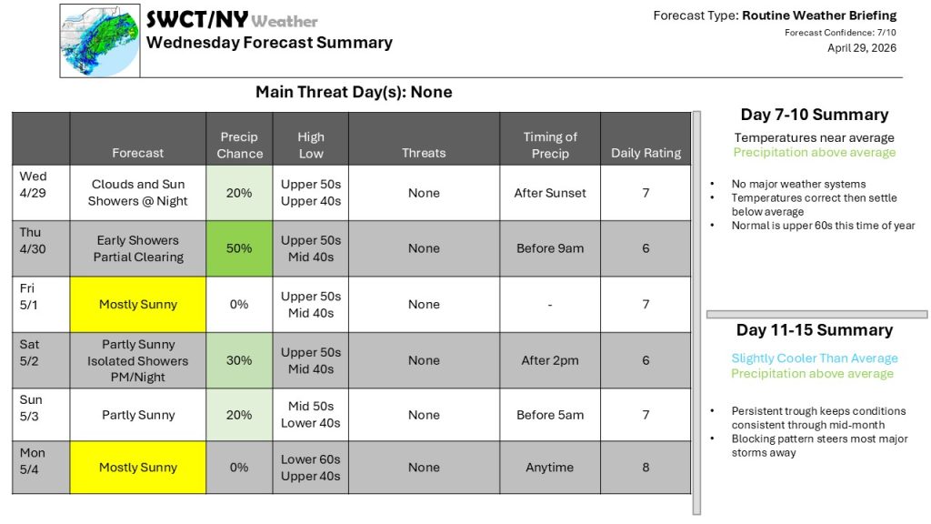 The active weather in the East drives the short-term, with a few showers around tonight, but the bigger story for the longer range is what’s happening out West. Cooler air dropping south there will eventually rebound, helping to build a strong ridge of high pressure from the western U.S. into Canada. In response, a trough settles in over the East into much of early May, keeping temperatures on the cooler side. The upside is that systems should keep moving, so while we’ll see occasional showers, this pattern does not favor long stretches of steady rain.