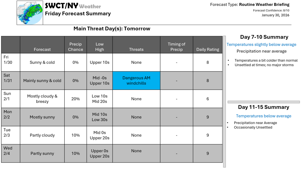 Good afternoon! We are settled through the start of next week thanks to surface high pressure being in charge across the region & almost the entire US. Temperatures remain a bit below normal through Friday with a more robust shot of cold air by Sunday arriving from central & northern Canada as part of the Polar Vortex moves by overhead and some energy moves through from southern Ontario. There is the potential for dangerous windchills Saturday with windchills as low as -20. No big storms are in sight!