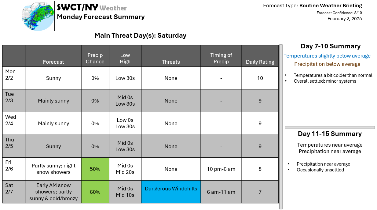 Good afternoon! We are settled through the start of next week thanks to surface high pressure being in charge across the region & almost the entire US. Temperatures remain a bit below normal through Friday with a more robust shot of cold air by Sunday arriving from central & northern Canada as part of the Polar Vortex moves by overhead and some energy moves through from southern Ontario. There is the potential for dangerous windchills Saturday with windchills as low as -20. No big storms are in sight!