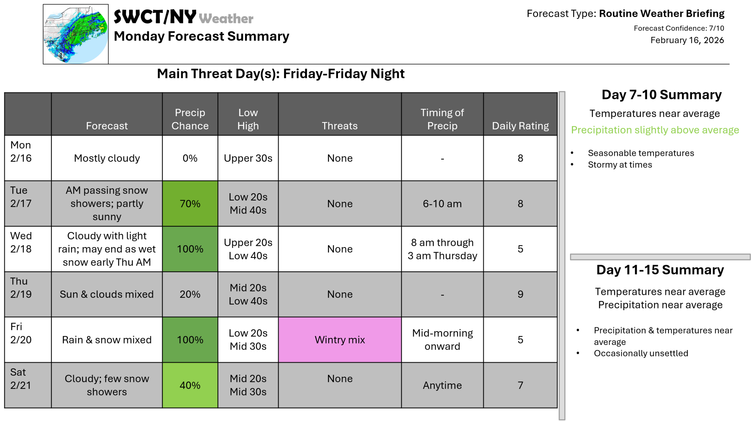 Good afternoon! A rather unsettled week is ahead as several systems move through from the Great Lakes offering us a mix of rain & snow. A more robust system moves through the region Wednesday morning through the predawn hours Thursday offering rain showers that may end as wet snow Thursday morning as colder air moves in from our north. This system moves along a warm front that will reside across the mid-Atlantic. By Friday into Saturday yet another storm system takes aim at us from our west offering a mix of rain & snow as of now.