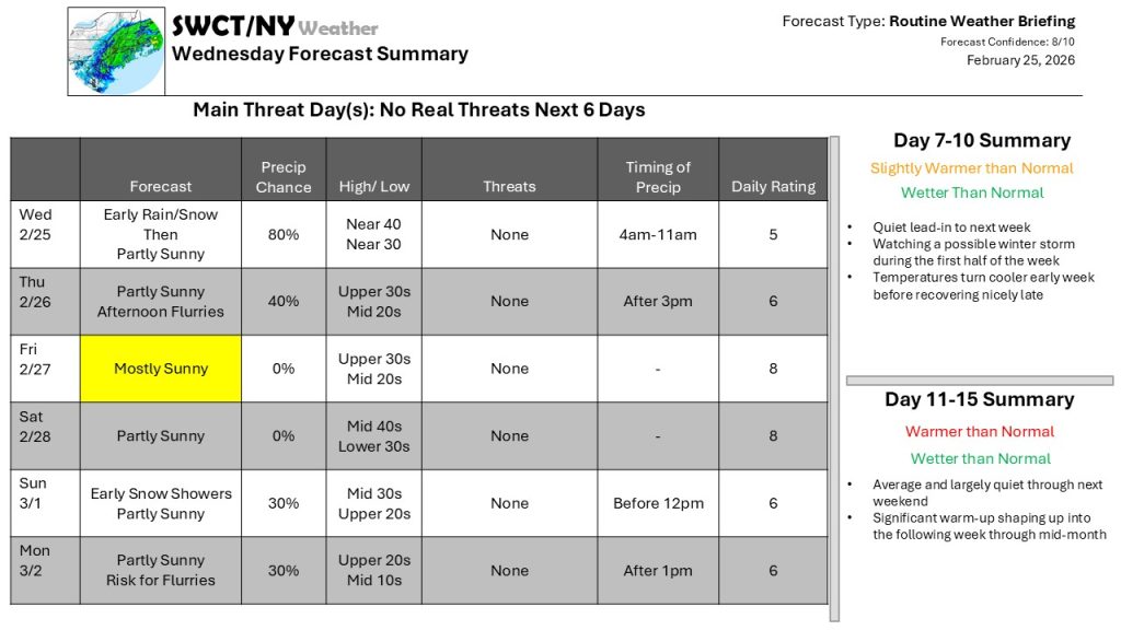 A series of weak weather systems will affect the Northeast over the next few days, but none will be particularly impactful, producing a few snow showers or flurries. Quiet weather will allow for some melting, but not too rapid; rapid enough to be noticeable, but slow enough to minimize any flooding concerns. We will have to watch for edge-ice, though – on the sides of roadways, driveways, sidewalks and the like in the morning hours as the melted snow refreezes at night.